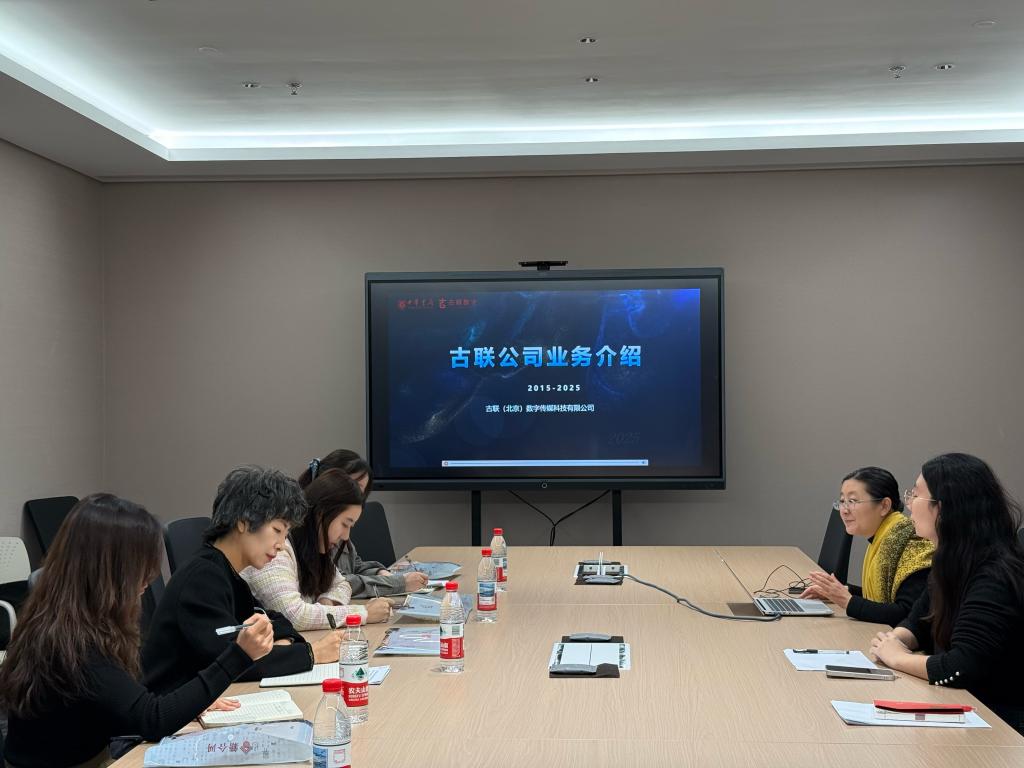 12月3日上午,调研团队前往古联公司开展调研交流。古联公司总编辑朱翠萍介绍了公司在古籍数字化、数据库集群建设与智能技术研发方面的成果。胡晓燕介绍了学院的学科特色、古籍整理与研究以及出版专业硕士的培养工作等情况。在共建的数字人文实验室平台基础上,双方围绕联合项目研究及学生实习就业等议题达成合作意向。
