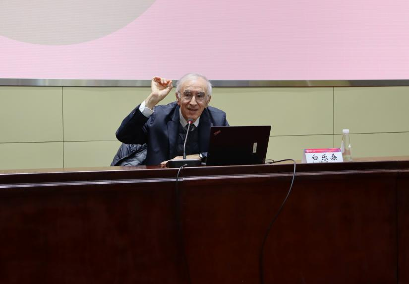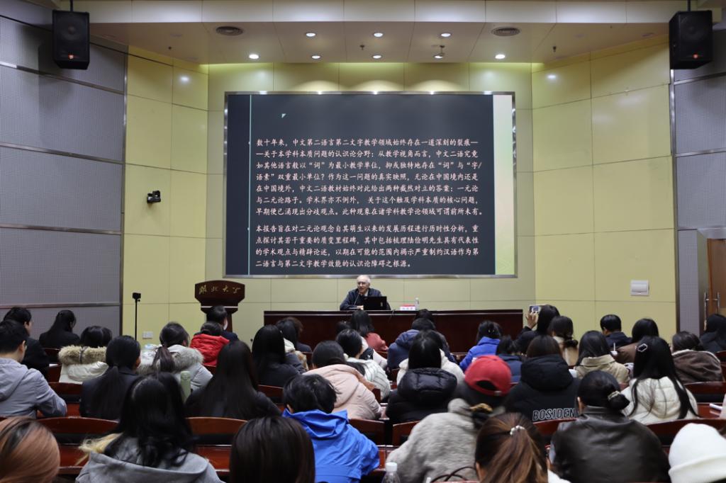12月4日上午,法国著名汉学家白乐桑(Joël BELLASSEN)教授在湖北大学会议中心思诚厅,做了题为《中文二语教学二元观的分期尝试》的学术讲座。讲座由文学院院长张鹏飞教授主持,文学院部分师生以及慕名而来的其他高校师生参加交流活动。