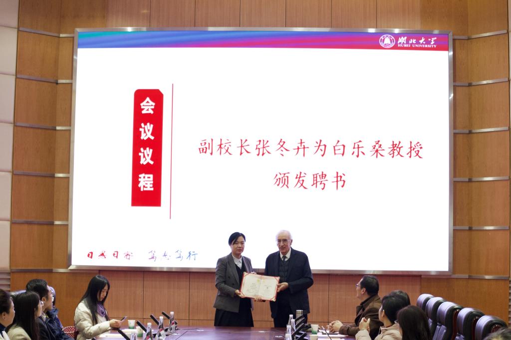 会上,张冬卉为白乐桑教授颁发聘书,回顾了湖北大学的发展历史与办学特色,介绍了学校在学科建设、人才培养、国际交流等方面的重要举措,并高度赞赏白乐桑教授在推进法国和欧洲汉语文化教育等方面的卓越成就。