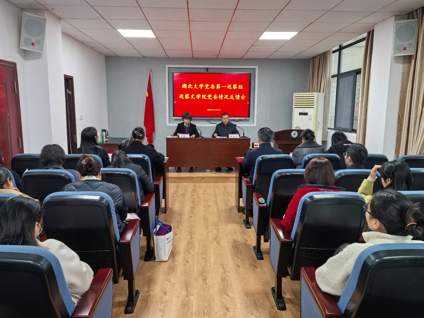 2025年12月31日下午,学校党委第一巡察组巡察文学院党委情况反馈会在逸夫楼B6016召开。学校党委第一巡察组全体成员,文学院全体领导班子、教职工、部分学生党员代表参加会议。文学院党委书记胡晓燕主持会议。