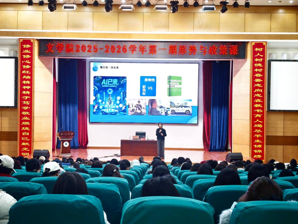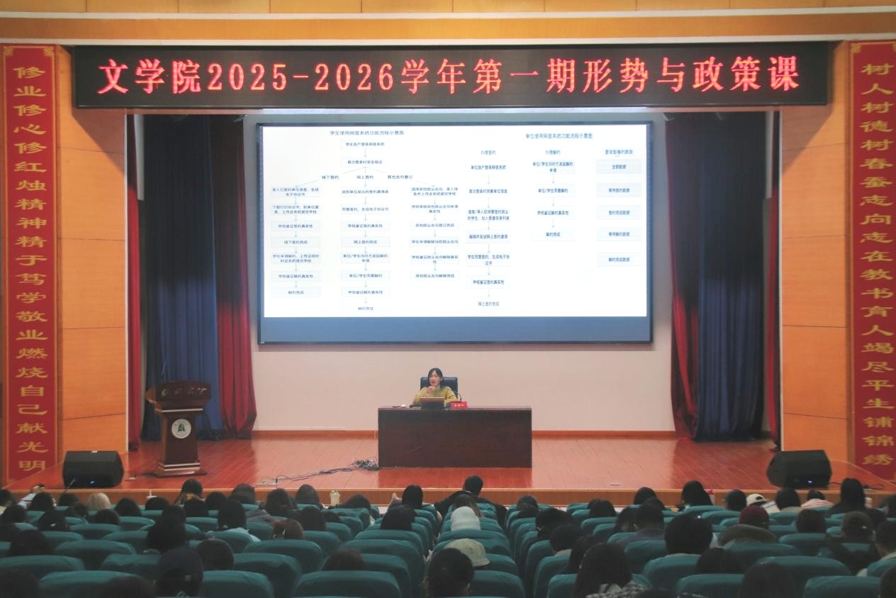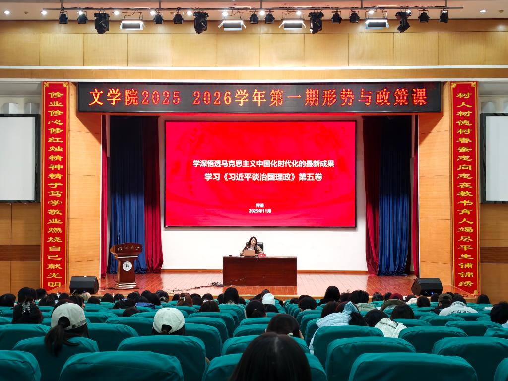 2025年11月19日,文学院在三号楼报告厅开展2025-2026年学年第一学期“形势与政策”集中授课,文学院党委书记胡晓燕、马克思主义学院副教授杨海军、文学院学工办主任李子萌、师范学院党委副书记乔荃等先后授课,文学院全体本科生参与学习。