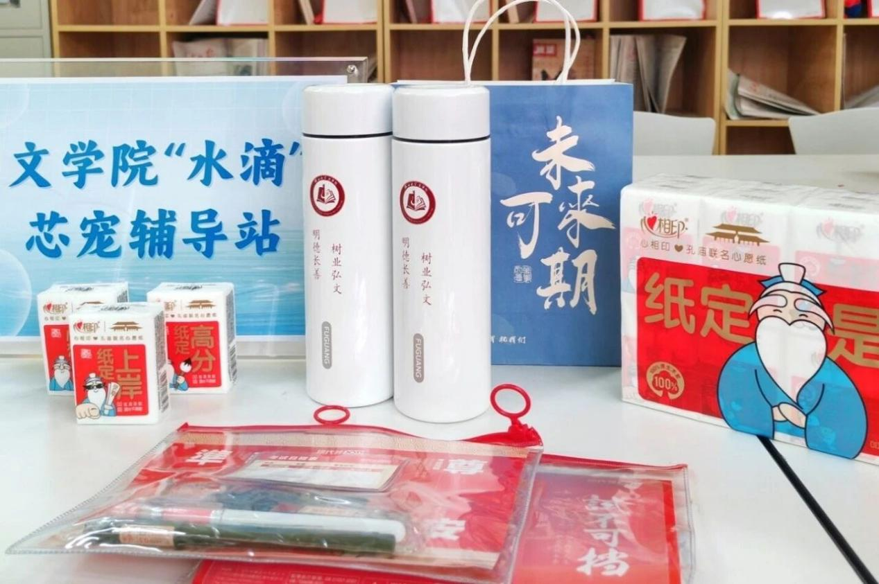 礼包中每件礼品均蕴含美好寓意:巧克力象征“巧克难题”,纸巾寄语“指定高分”,文具套装助力“落笔生花”,定制保温杯上刻有院训“明德长善,树业弘文”,寄托了祝愿学子们研途顺利、“水到渠成”的真挚心意。细节之中寓意深远,凝聚着学院对学生的深切关怀与殷切期望。