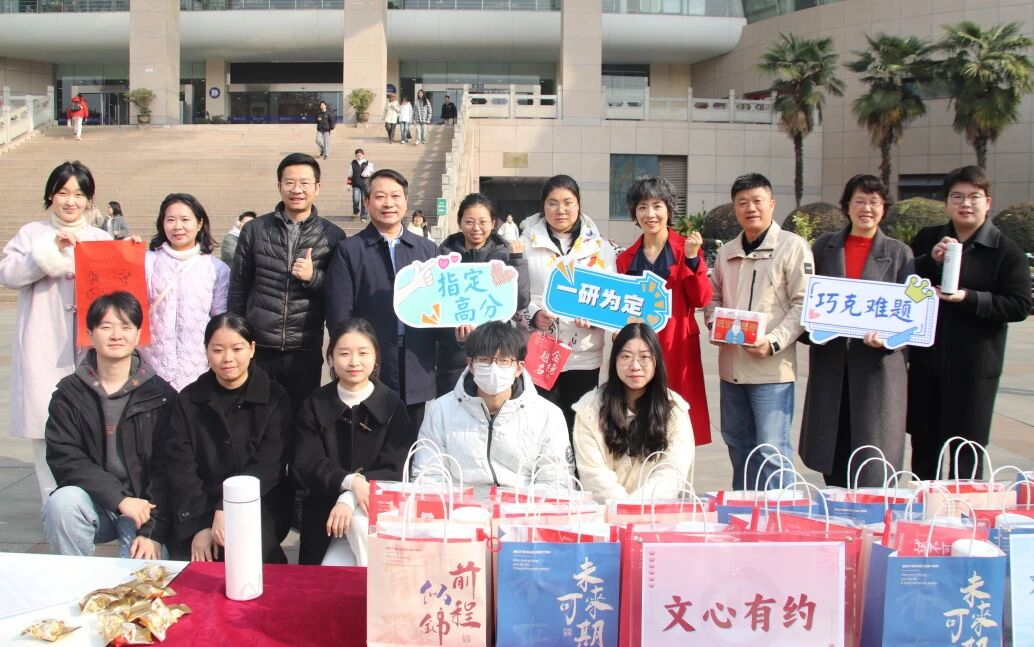 岁聿云暮,一元复始。2025年12月11日上午,文学院“文心有约·研途笃定”考研送温暖活动在图书馆前求索广场顺利举行,助力学子踏实走好“考研最后一公里”。文学院党委书记胡晓燕、院长张鹏飞、院党委副书记张程、副院长刘继林、彭安湘以及党政教辅工作人员、班主任代表来到现场,为正在紧张备考的学子送上冬日的问候与祝福。