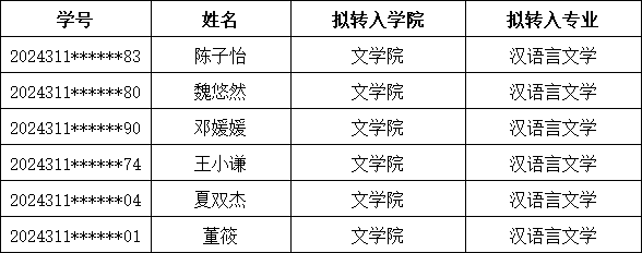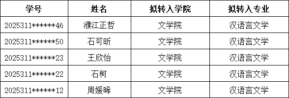 根据《湖北大学普通本科生转专业和大类分流管理办法》(校教字〔2024〕21号)、《2025年秋季学期文学院转专业工作方案》精神,经学生报名、学院审核、笔试、面试考核,文学院拟接收转专业学生11人(2025级5人、2024级6人),现将名单公示如下: