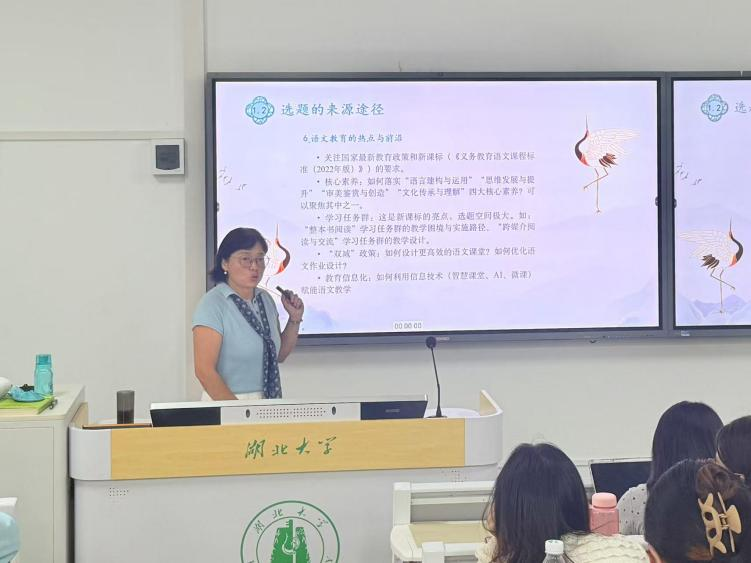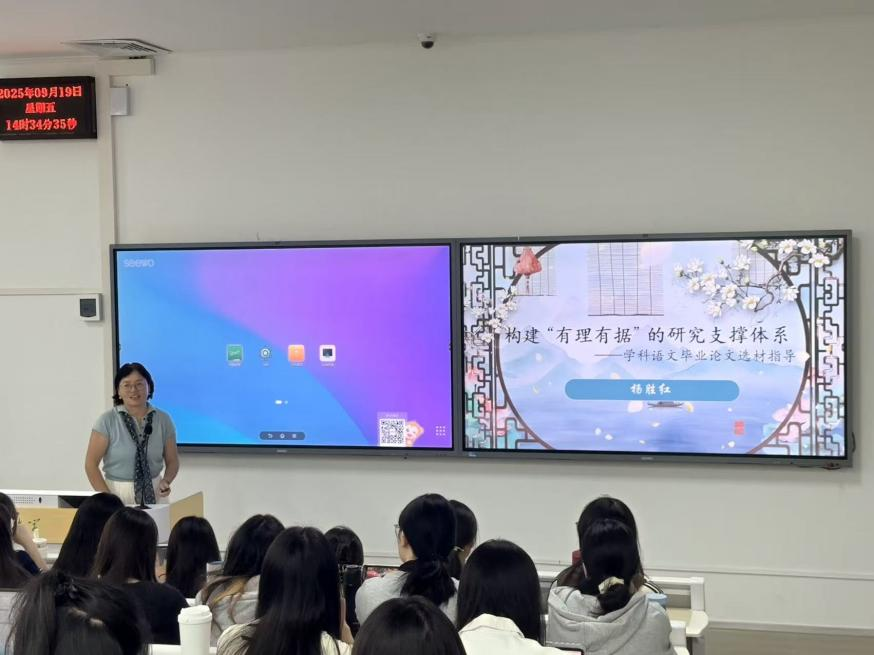 2025年9月19日下午,湖北大学文学院在4号教学楼305教室举行《硕士研究生论文写作指导》课程专题学术讲座。讲座特邀校外专家、文学院学科语文专业兼职硕导、武昌区教育局招生考试办公室书记杨胜红老师,面向2024级学科教学(语文)专业硕士研究生70余人,以“构建‘有理有据’的研究支撑体系——学科语文毕业论文选材指导”为主题开展深入讲解。讲座由文学院刘颖老师主持。