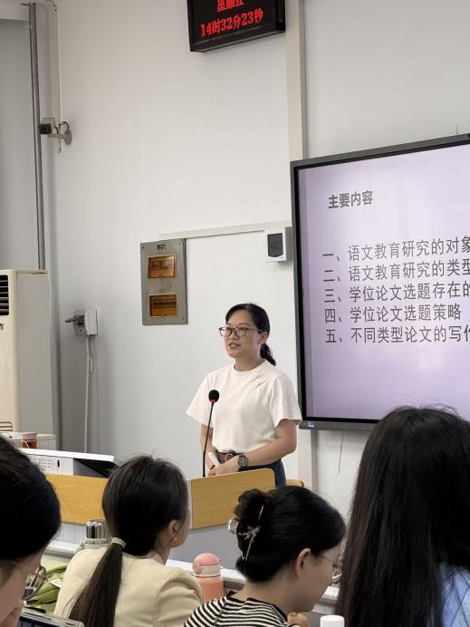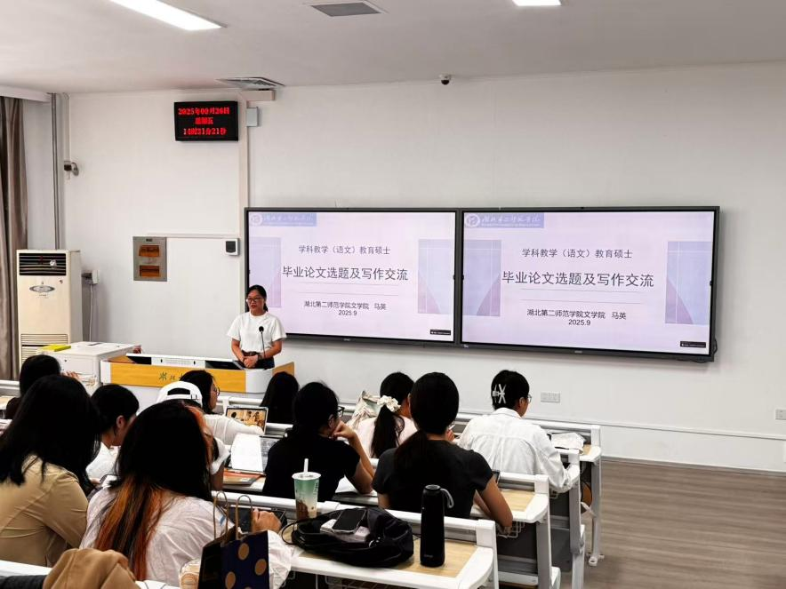2025年9月26日下午14点30分,湖北大学文学院特邀湖北第二师范学院文学院副教授、汉语言文学专业负责人马英老师为2024级专业硕士研究生做了名为《学科语文专业硕士研究生论文写作指导》的专题讲座。讲座在4号教学楼305教室举行,文学院2024级学科语文专业硕士研究生70余人现场聆听了此次讲座。讲座由文学院刘颖老师主持。