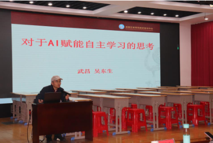 活动伊始,东湖中学王朝文校长开场致辞,对与会教师与研究生同学的到来表示热烈欢迎,并介绍了本次教研活动的主题与意义。随后,武昌区语文教研员吴东生老师作了题为《对于 AI 赋能自主学习的思考》的主题发言。他从教育理念与课堂实践两方面深入探讨了 AI 在促进学生个性化、自主化学习中的价值与挑战。吴老师强调,教师应学会与 AI 协作,将智能技术作为课堂改革的助推器,帮助学生实现更高水平的自我学习与自我成长。