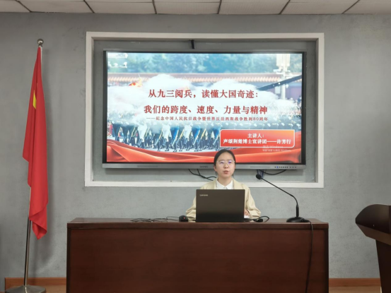 培训还创新采用丰富的教学方式,组织全体学员集体观看电影《731》,强化历史使命感;文学院声颂荆楚博士宣讲团成员许芳行以“从九三阅兵读懂中国力量”为主题开展实践交流,激发学员爱国热情。