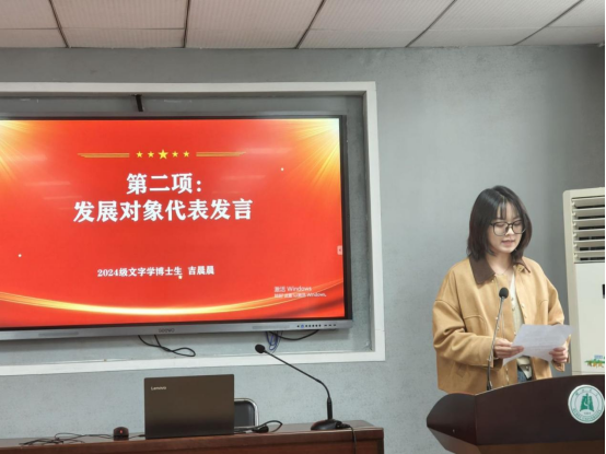11月12日下午,院党校培训班举行结业仪式。入党积极分子代表2024级汉语言文学本科生张子君、发展对象代表2024级文字学博士生吉晨晨分别发言,他们表示,将更加积极地向党组织靠拢,用实际行动践行自己的信念,争取早日成为一名合格的共产党员。