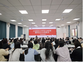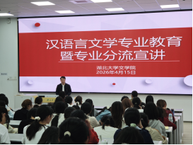 为帮助2025级本科生全面了解专业分流政策、明晰各专业方向培养特色,解答学生在专业选择上的困惑与疑问,4月15日下午,湖北大学文学院在长江新区校区问津楼B300教室举办2025级汉语言文学专业教育暨专业分流宣讲会。文学院院长张鹏飞、党委副书记张程、副院长彭安湘,专业负责人、班主任、教学秘书及2025级全体本科生(含师范生)参加会议。会议由彭安湘副院长主持。