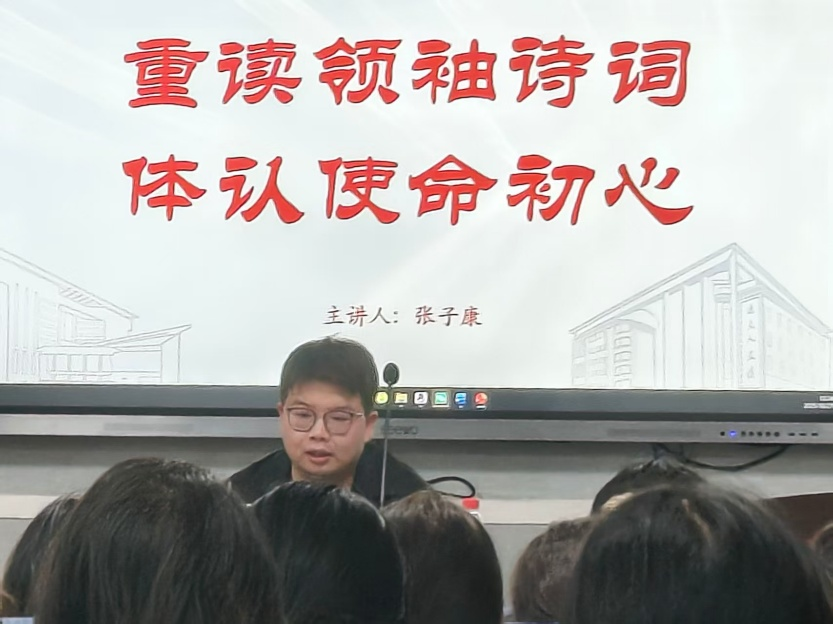 10月27日晚,文学院团委书记张子康讲授第一场团课《重读领袖诗词 体认使命初心》。通过文史互证,张老师结合诗词案例,讲述了毛泽东诗词鲜明的“革命浪漫主义”特色,以及革命史和建设史中的奋斗过程,并引导学员深刻领悟前贤先辈“筚路蓝缕 以启山林”的理想信念与人民立场。