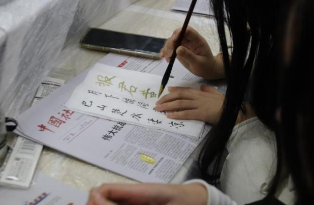 “承古韵·书法传薪火”环节中,学校书法协会陶春雅同学从基础笔画、握笔姿势到运笔方法细致讲解,并围绕主题关键词进行演示。同学们认真倾听,随后纷纷提笔挥毫,在宣纸上临摹创作,以笔墨寄情,书写对“十五五”蓝图的憧憬与青春的理想。